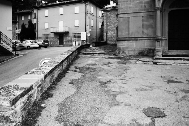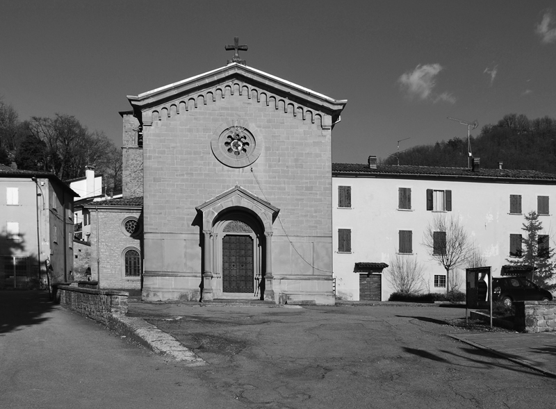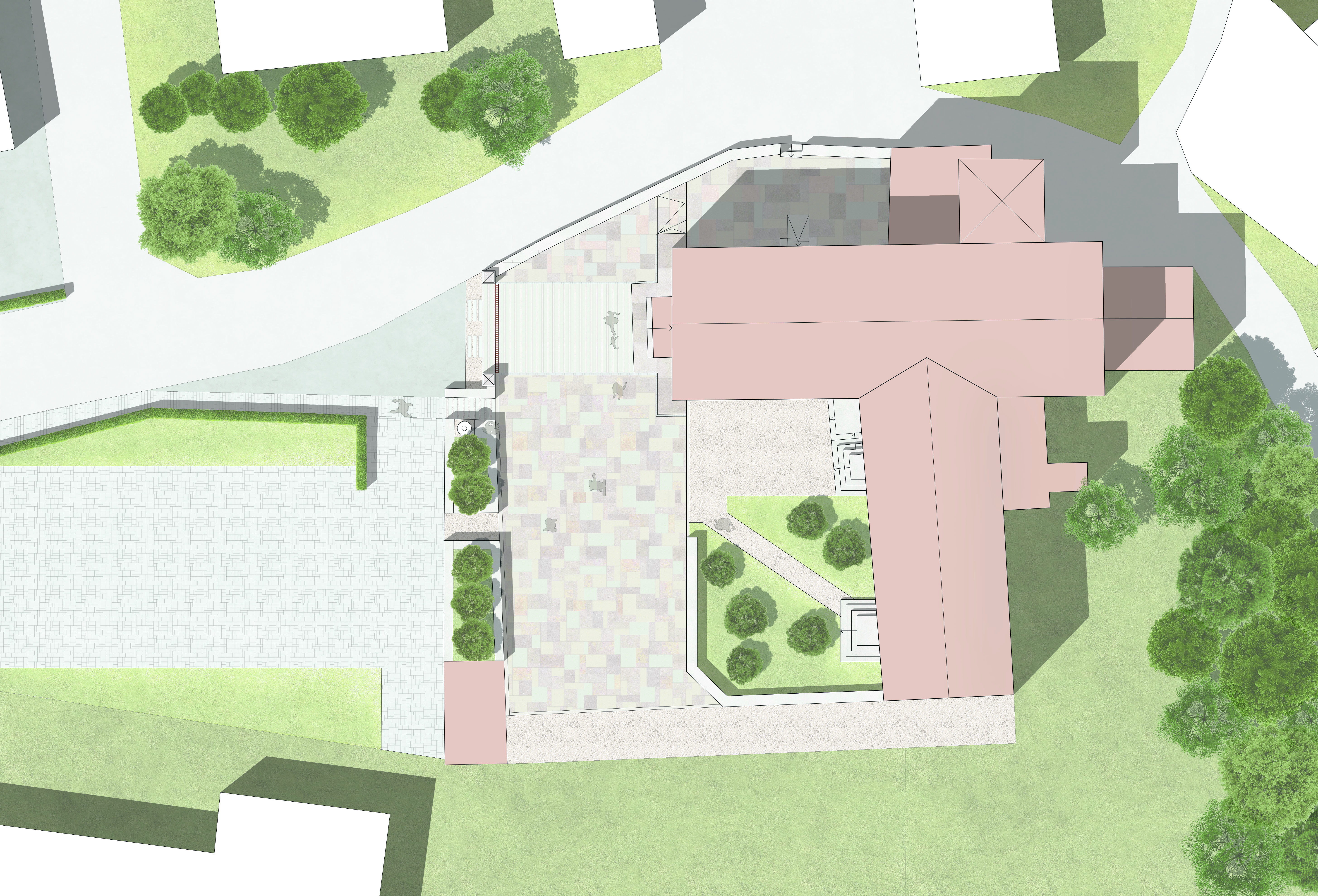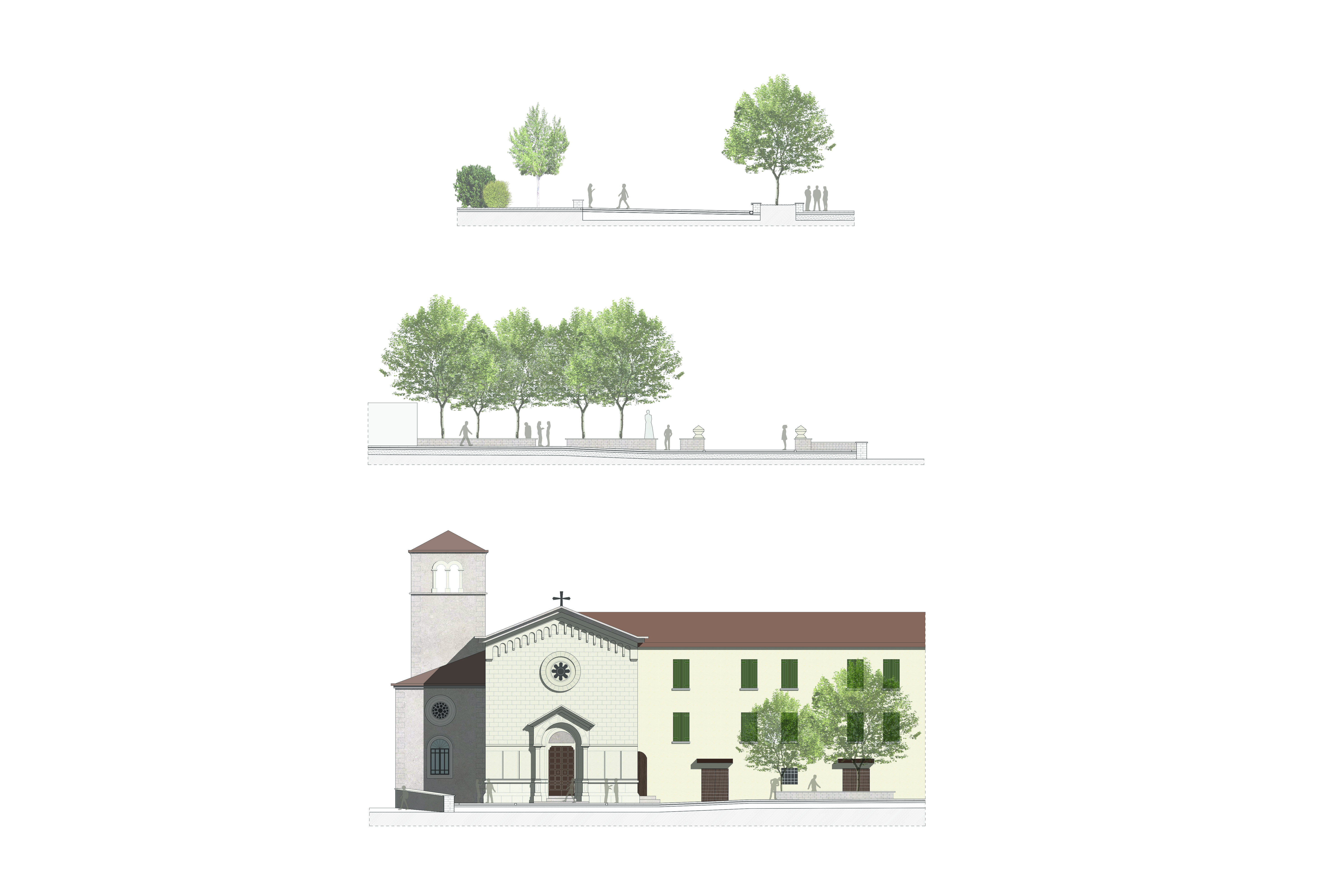 Il progetto si pone come obiettivo la definizione di uno spazio collettivo di alta qualità architettonica che permetta di trasformare un parcheggio in uno spazio aperto flessibile. Si vuole in questo modo favorire la configurazione di uno spazio che possa essere sia di supporto alla funzione liturgica, sia di ampio utilizzo per la cittadinanza. Il progetto prevede una porzione della pavimentazione disegnata con strisce parallele bocciardate, di larghezza differente, posate a correre che rallentano la camminata durante l’ingresso. Il resto del sagrato viene invece rivestito con lastre di pietra a spacco, squadrate a mano, posate in modo irregolare. I cordoli tra le diverse campiture sono realizzati con smolleri tranciati. I ciotoli di fiume all’ingresso segnano invece la soglia verso la strada. Le diverse finiture (bocciardata, tranciata, a spacco) del medesimo materiale (pietra arenaria locale)permettono di creare una pavimentazione caratterizzata da diverse grane che consentono numerosi riflessi di luce.